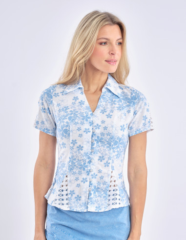 Short-sleeved fitted blouse in 100% cotton. Highly appreciated for its cut, its embroidery and its openwork lace cutouts, this blouse is perfect for a classic chic look. Also available in long sleeve version (ref 443).