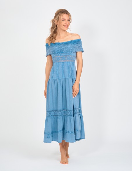 Robe mi-longue en coton, avec épaules dénudées et volant en crochet ! Chic et décontractée, elle se porte en toutes circonstances !